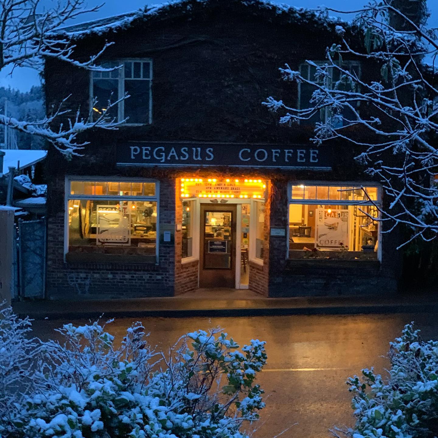 Pegasus opened in 1980 as the first coffee house on Bainbridge Island – establishing a friendly place about 30 minutes by ferry from downtown Seattle, WA. The beans were roasted out back, the food was made from scratch and the location (in an ivy-covered brick building down on the waterfront in Eagle Harbor) quickly became a local landmark.